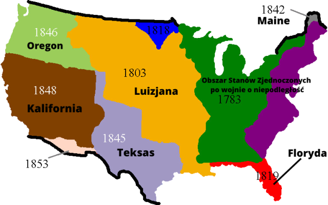 Po podpisaniu pokoju wersalskiego kończącego wojnę o niepodległość Stany Zjednoczone obejmowały tereny 13 pierwszych kolonii oraz część terytoriów na zachód, wraz z miastami Detroit i Chicago. Pierwszym nabytkiem była Luizjana, którą Amerykanie kupili od Napoleona w 1803 r. Następnie, w 1819 r., od Hiszpanii zakupiona została Floryda. W wyniku wojny z Meksykiem anektowano Teksas oraz zajęto Kalifornię, a Wielka Brytania odstąpiła amerykanom Oregon. Wszystkie te ostatnie zdobycze zostały przyłączone w latach 40. XIX w.
