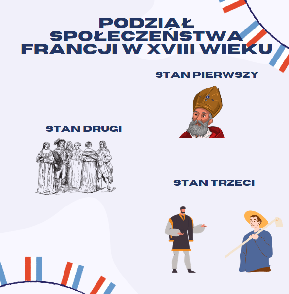 Francuskie społeczeństwo w XVIII wieku dzieliło się na stan pierwszy, czyli duchowieństwo, które nie płaciło podatków i miało w posiadaniu około 10% ziem; stan drugi – szlachta także zwolniona z większości podatków i posiadająca jedną czwartą ziem; stanu trzeciego, czyli całej reszty, która płaciła podatki i była najliczniejsza: chłopi i biedni ludzie, średniozamożni i wykształceni mieszczanie oraz burżuazja, czyli kupcy, handlowcy, właściciele manufaktur.