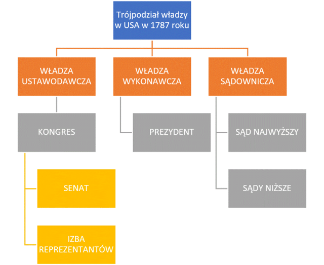 Przedstaw w formie grafiki podział władz USA na władzę ustawodawczą (Kongres – Senat i Izba Reprezentantów), wykonawczą (Prezydent USA) i sądowniczą (Sąd Najwyższy oraz inne sądy).