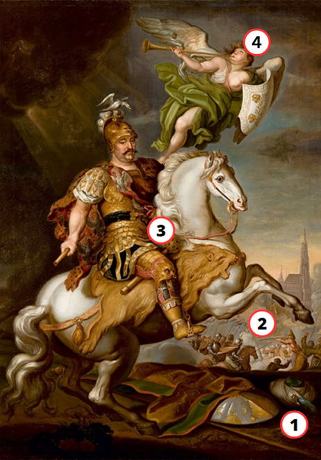 · Pancerz i oręż turecki, które symbolizują pokonane wojska osmańskie i bogate łupy wzięte z obozu Kara Mustafy.