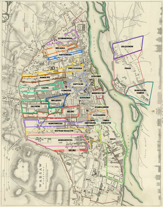 W tym zadaniu musisz wskazać na planie XVIII-wiecznej Warszawy jurydyki magnackie, w tym Bielino.