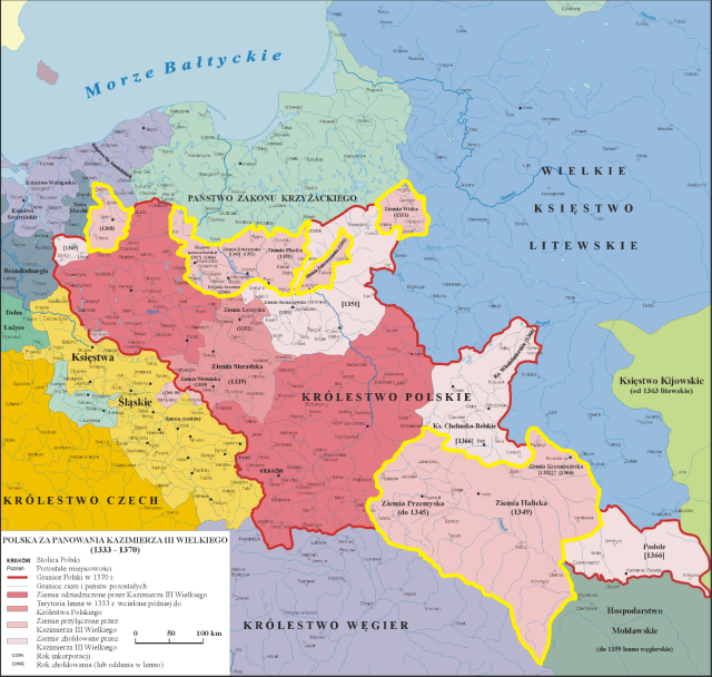 źródło: https://commons.wikimedia.org/wiki/File:Polska_1333_-_1370.png, Poznaniak,Mapa Polski za panowania Kazimierza III Wielkiego (1333 - 1370), licencja CC, zmienione.