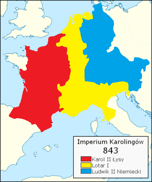 Podział monarchii karolińskiej związany był ze śmiercią Karola Wielkiego, który w 843 roku podzielił ziemie królestwa między swoich trzech wnuków.
