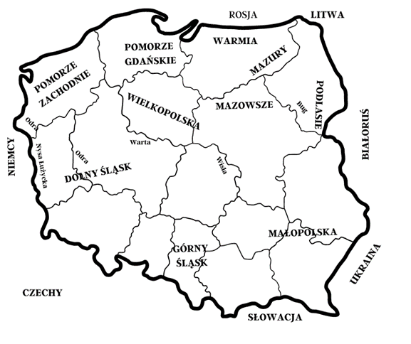 Polska leży w Europie Środkowej i graniczy z siedmioma krajami: Rosją, Litwą, Białorusią, Ukrainą, Słowacją, Czechami i Niemcami. Ma też dostęp do Morza Bałtyckiego. W Polsce możemy też wyróżnić kilka regionów, czyli części kraju, które różnią się od siebie krajobrazem, historią i kulturą. Polska dzieli się na sześć głównych regionów: Pomorze, Wielkopolska, Śląsk, Warmia i Mazury, Mazowsze z Podlasiem i Małopolskę. Na mapie możesz podzielić dodatkowo Pomorze na Pomorze Zachodnie i Gdańskie i rozdzielić Warmię, Mazury, Podlasie i Mazowsze.