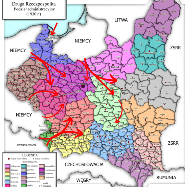 Zaznacz, że III Rzesza zaatakowała Polskę z zachodu i uderzyła właściwie całej długości granicy. Niemcy wkroczyli do województw: