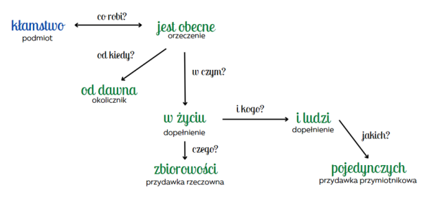 Zdania pojedyncze można przedstawić za pomocą wykresu zdania. W przypadku, gdy mamy do czynienia z wielowyrazowymi określeniami z nazwą własną lub związkiem frazeologicznym, musimy potraktować je jako jedną całość.