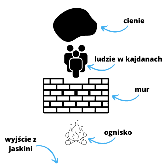 Sokrates opisuje jaskinię, do której prowadzi obszerne wejście. Znajdujący się w grocie ludzie są jednak skuci i mogą patrzeć jedynie na ścianę jaskini. Światło zasłania im dodatkowo mur postawiony między nimi a ogniskiem.