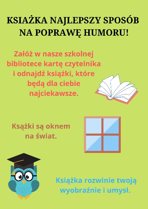 Propozycje zachęcających haseł na plakacie: „Książka rozwinie twoją wyobraźnię i umysł”, „Książki są oknem na świat”., „Załóż w naszej szkolnej bibliotece kartę czytelnika i odnajdź książki, które będą dla ciebie najciekawsze. Narysuj na plakacie ciekawe obrazki odnoszące się do czytelnictwa np. książkę, sowę, półkę z książkami.