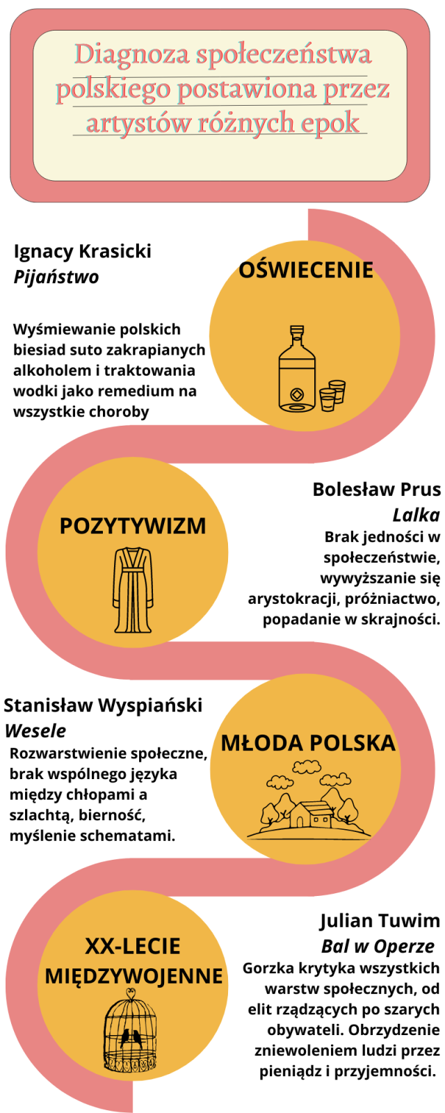 W tym zadaniu musisz stworzyć infografikę, dzięki której przedstawisz diagnozy społeczeństwa polskiego postawione przez twórców różnych epok. Wśród przykładów musisz odnieść się do Balu wOperze.