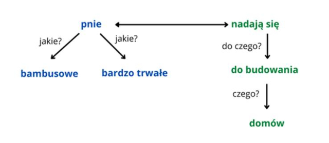 Grupa podmiotu (na niebiesko): pnie (podmiot), bambusowe (przydawka), bardzo trwałe (przydawka)