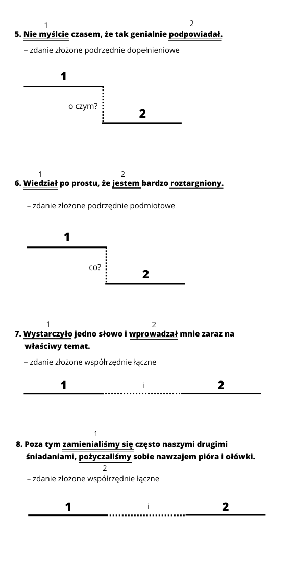 Wykonaj wykresy zdań złożonych z zadania 1a. Ustal nazwy tych zdań. Rozpisz relacje między zdaniami, jeśli są wielokrotnie złożone.