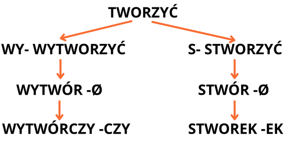 Uzupełnij podany schemat. Następnie wyodrębnij rdzenie w utworzonej rodzinie wyrazów i wypisz ich oboczności. Dopisz inny wyraz pokrewny.