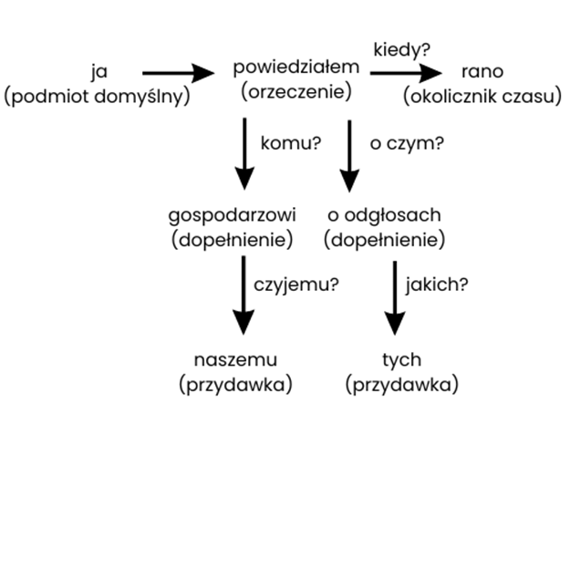 Zdanie tworzą następujące części zdania: podmiot, orzeczenie, dopełnienie, przydawka, okolicznik.