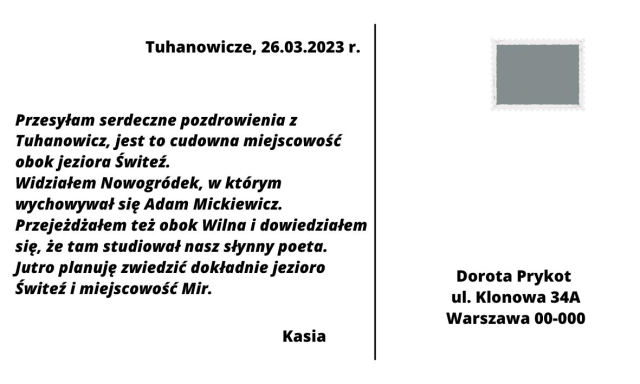 Podczas wykonywania zadania możesz wykorzystać nazwę miejscowości, w której dorastał Adam Mickiewicz, mowa tu o Nowogródku. Poeta studiował natomiast w Wilnie. Pamiętaj, aby ku górze pocztówki znajdowała się miejscowość i data. Podpisz swoje pozdrowienia.