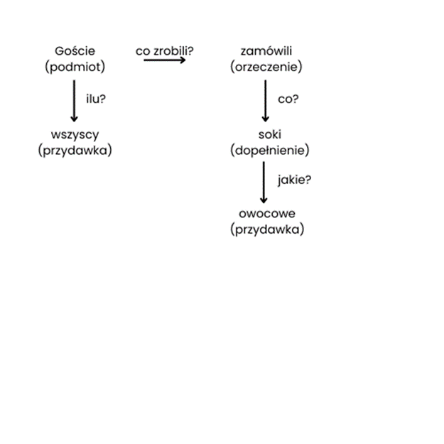 Uzupełnij wykres zdania: „Wszyscy goście zamówili soki owocowe.”, a następnie nazwij jego części.