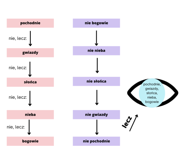 Zauważ, że porównania najpierw idą od pochodni do bogów, a następnie są symetrycznie zaprzeczane – od bogów do pochodni. Na koniec zostają zsumowane w „jednym oka słowie” – poeta uważa więc, że opisywane oczu zawierają na raz wszystkie te zalety, o których mówił za pomocą porównań.
