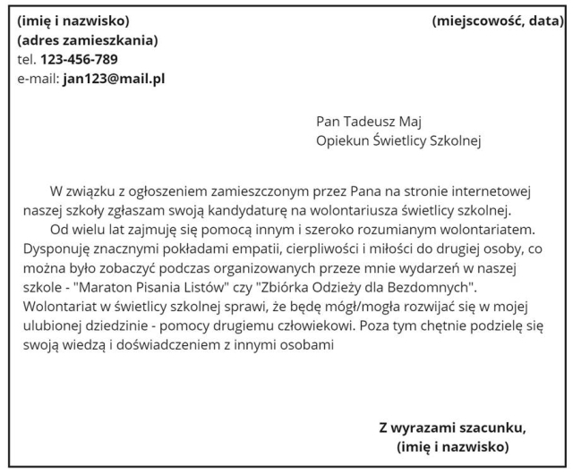 Twoje rozwiązanie może wyglądać zupełnie inaczej. Potraktuj odpowiedź zawartą w rozwiązaniu jako inspirację do stworzenia własnego listu motywacyjnego.