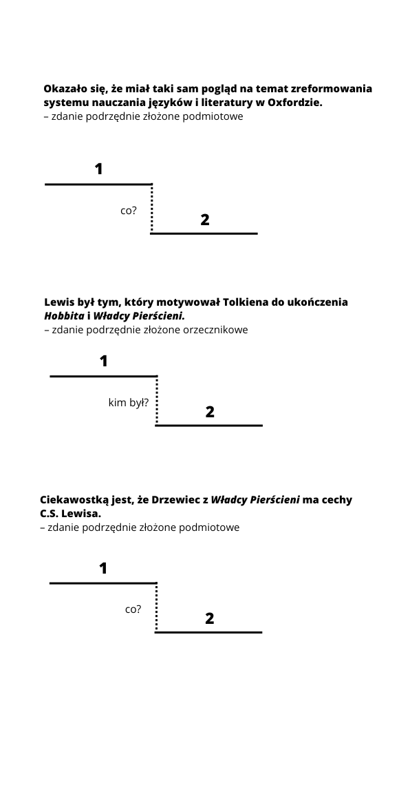 Zdanie złożone podrzędnie podmiotowe składa się z dwóch zdań składowych, z których podrzędne odpowiada na pytania podmiotu. W zdaniu podrzędnie złożonym orzecznikowym zdanie podrzędne odpowiada na pytania kim jest? jaki jest? (podmiot). Wykonaj i podpisz wykresy zdań złożonych podrzędnie (podmiotowych oraz orzecznikowych).