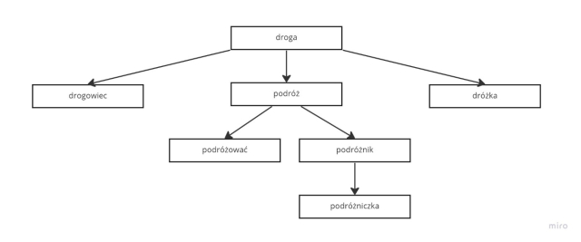 B. droga, dróż–ka, drog–owiec, po–dróż, podróż–ować, podróż–nik, podróżnicz–ka.