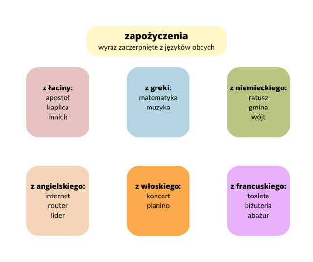 Napisz notatkę o rodzajach zapożyczeń. Powinna być w formie mapy myśli – pamiętaj o zastosowaniu przykładów i rysunków.