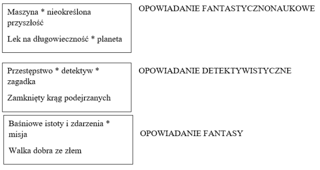 W tym zadaniu połącz podane elementy świata przedstawionego z odpowiednim rodzajem opowiadania, w którym mogłyby występować.
