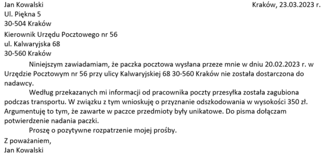 W tym ćwiczeniu musisz napisać pismo z reklamacją w sprawie zgubionej przesyłki, adresowane do kierownika urzędu pocztowego. Zwróć uwagę na to, aby Twoja wypowiedź odpowiadała stylowi urzędowemu – zachowaj umiar w wyrażaniu emocji i unikaj potocznego słownictwa.