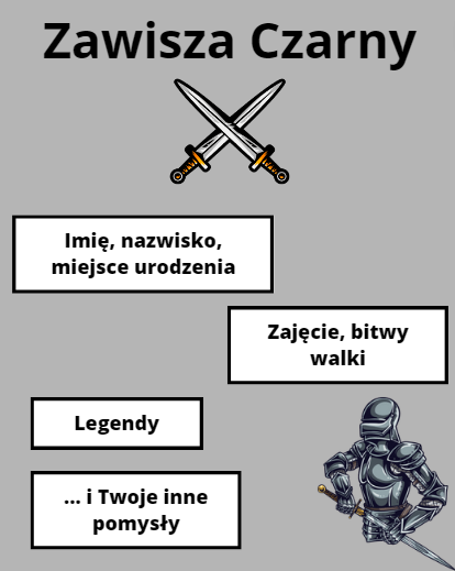 Należy wykonać np. plakat/ulotkę/planszę lub inną formę graficzną, na której wypiszecie najbardziej istotne fakty dotyczące Zawiszy.