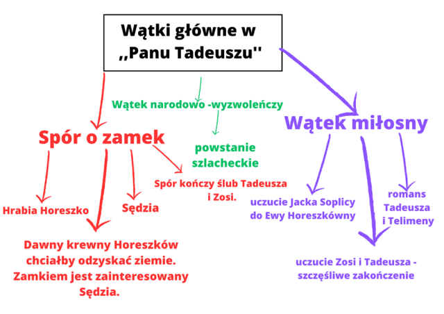 W utworze występuje kilka wątków, które pojawiają się przez całą fabułę dzieła. Wątki główne to spór o zamek, wątek miłosny, wątek patriotyczny – narodowo – wyzwoleńczy.