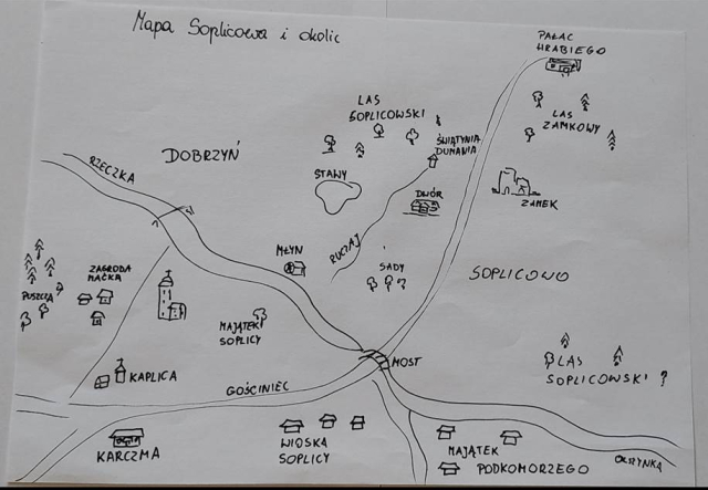W tym zadaniu musicie opracować w zespołach schematyczne plany Soplicowa oraz jego okolicy. Wyszukajcie potrzebne informacje w tekście. Podpiszcie wszystkie obiekty.