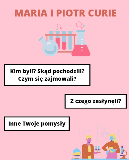 Musisz wypisać informację o Marii i Piotrze Curie, a następnie stworzyć z nich krótką notkę w postaci np. plakatu, ulotki itp.