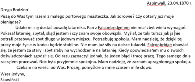 W tym zadaniu musisz wcielić się w postać Skawińskiego i napisać list skierowany do rodziny w Polsce. Zrelacjonuj w nim przebieg rozmowy z Falconbridge’em i podziel się przemyśleniami na temat obecnej sytuacji.