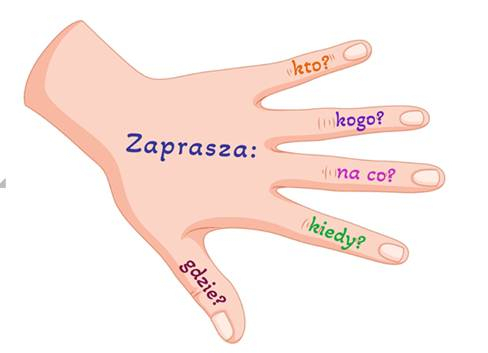 Pisząc zaproszenie należy pamiętać o 5 pytaniach, na które musi odpowiadać jego treść. Łatwo zapamiętać to przy pomocy poniższego polonistycznego grafu.