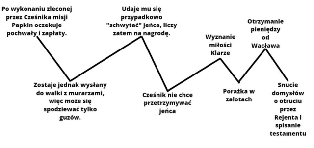 Zapisz wzloty i upadki Papkina. Umieść je w odpowiednim miejscu na schemacie. Czy tak gwałtowne przeżycia i zmiany sytuacji sprawiają, że możemy się śmiać z bohatera? O czym to świadczy?