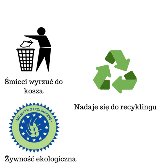 Pierwszy znak przypomina o tym, że śmieci należy wyrzucać do specjalnie przeznaczonych do tego pojemników. Drugi – produkt nadaje się do recyklingu, czyli dana rzecz można zostać użyta ponownie. Trzeci – żywność została wyprodukowania z według określonych zasad np. bez użycia nawozów.