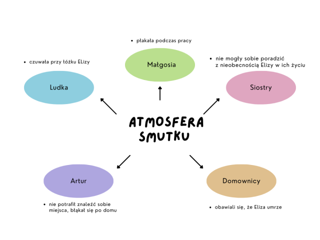 Zastanów się, jak toczyło się życie w domu Elizy, gdy dziewczynka była chora? Wraz z koleżanką lub z kolegą z ławki stwórzcie mapę myśli, poprzez którą opiszecie w zeszycie nastroj panujący w rodzinie Elizy oraz zachowania domowników.