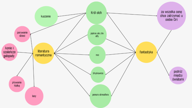Wspólne elementy – nawiązania do literatury romantycznej to : postać Króla olch, postaci pięknych, ale groźnych elfów, atmosfera grozy, którą tworzy noc, błyskawice. Pozostałe elementy są charakterystyczne tylko dla literatury romantycznej : porywanie dzieci, konie i szaleńcze galopady, pływanie łódką.
