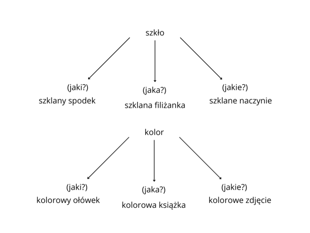 W tym zadaniu należy utworzyć przymiotniki od podanych rzeczowników. Pamiętaj o odpowiednim rodzaju przymiotników. Zadaj pytania Jaki? Jaka? Jakie?