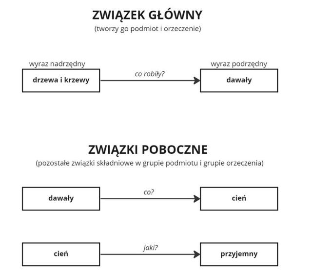 Związki składniowe to zespoły składniowe, w których jeden człon jest nadrzędny (określany), a drugi podrzędny (określający). Związek podmiotu i orzeczenia nazywamy związkiem głównym. Związki poboczne to pozostałe związki składniowe w grupie podmiotu i grupie orzeczenia.