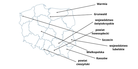 W tym zadaniu odpowiednio uzupełnij luki, wpisując pierwsze litery podanych nazw regionów, województw, powiatów, miast i wsi, a następnie połącz je z odpowiednimi miejscami na przedstawionej mapie Polski.