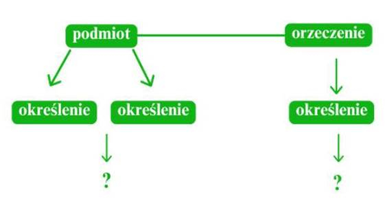 W zadaniu musisz przyjrzeć się schematowi i wskazać, jakie podpisy powinny się znaleźć zamiast znaków zapytania. Następnie każdy wyraz podanego zdania dopasuj do odpowiednich elementów schematu.