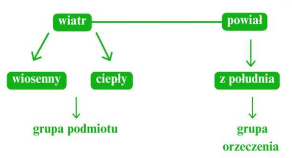 Podmiot i orzeczenie tworzą związek główny zdania. Orzeczenie wraz z określeniami tworzą grupę orzeczenia, a podmiot wraz z określeniami tworzy grupę podmiotu.