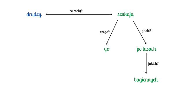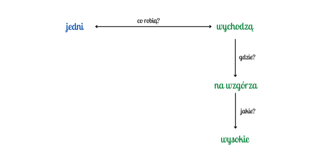 Każde zdanie pojedyncze rozwinięte można zobrazować za pomocą schematu, który składa się z grupy podmiotu (wykonawca i określenia, które go dotyczą) oraz grupy orzeczenia (czynność lub stan i określenia, które go dotyczą), a także pytań pomocniczych odnoszących się do poszczególnych wyrazów tworzących zdanie.