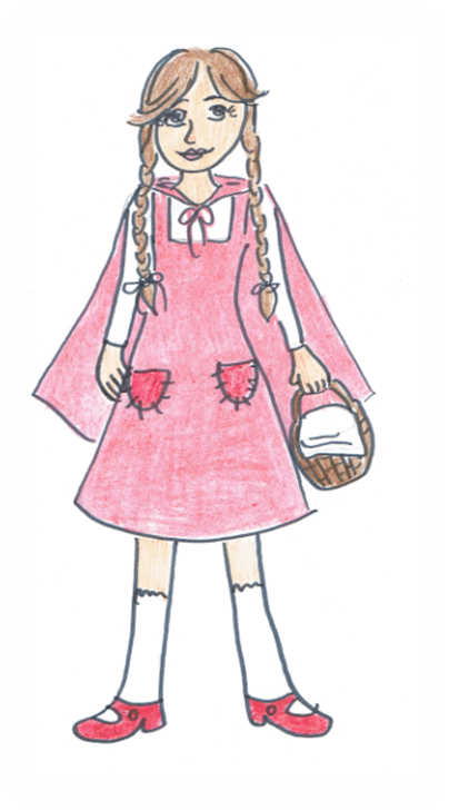 Czerwony Kapturek to dziewczynka o brązowych włosach, zaplecionych w warkocze. Jest uśmiechniętą dziewczynką. Nosi czerwoną sukienkę z białym fartuszkiem. Na głowę ma założony czerwony kapturek. Jej buty również są w czerwonym kolor. W ręce dziewczynka trzyma koszyk ze smakołykami dla babci.
