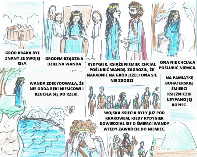 W tym zadaniu musisz poszukać w szkolnej bibliotece legend o założeniu polskich miast. Na podstawie legendy, która najbardziej ci się spodobała, wykonaj w zeszycie komiks.