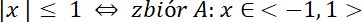 Należy zaznaczyć wszystkie punkty na osi liczbowej, których odległość od 0 jest nie większa od 1, czyli do zbioru należą wszystkie punkty ze zbioru: <–1,1 >. Kolorem niebieskim zaznaczono zbiór rozwiązań nierówności.