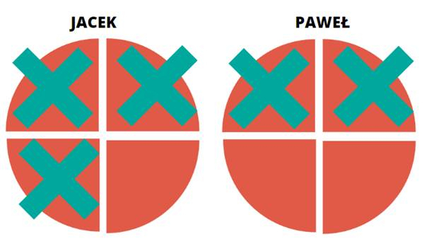 Ustal, jaką część jabłka zjadł Paweł i Jacek, jeśli Jacek zjadł 3 z 4 części, a Paweł 2 z 4 części.