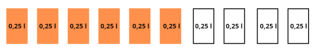 Zauważ, że litr napoju zmieści się w 4 szklankach, a pół litra w 2 szklankach: 4 + 2 = 6 szklanek.