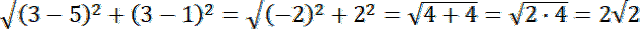 Punkt przecięcia się prostych to R(3, 3). Obliczamy odległość odcinka |PR|.