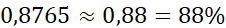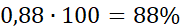 W pierwszym kroku musisz zaokrąglić podaną liczbę do dwóch miejsc po przecinku. Liczba 6, która jest na trzecim miejscu po przecinku, zaokrągla się w górę, dlatego otrzymujemy liczbę 0,88. W kolejnym kroku należy przemnożyć uzyskany ułamek dziesiętny przez 100, aby otrzymać liczbę procentową: