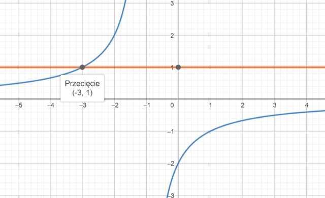 By rozwiązać równanie, sprawdź dla jakiej wartości x wykresy funkcji f (kolor niebieski) i funkcji danej wzorem y = 1 (kolor pomarańczowy) się przecinają.